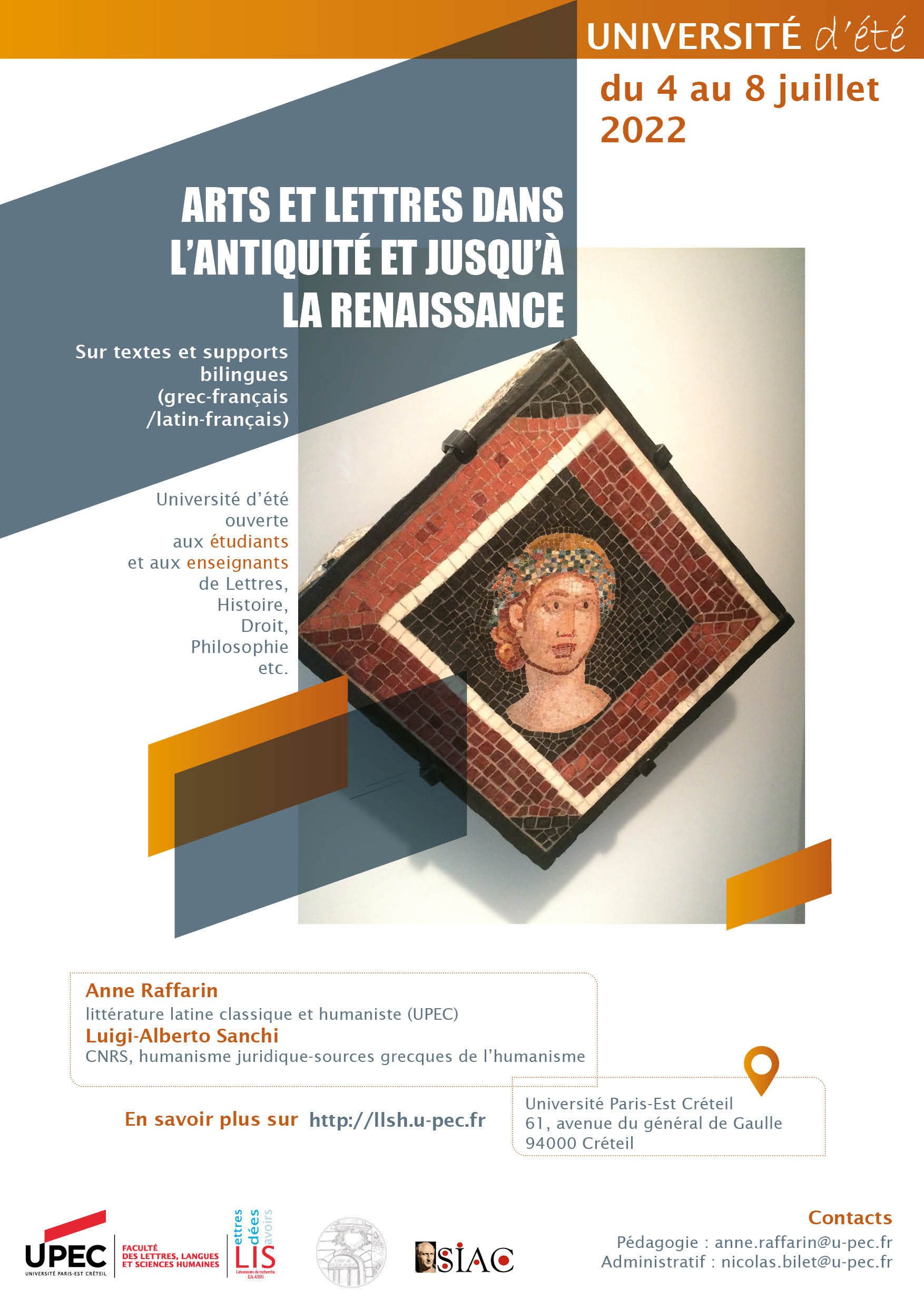 Organisé par Anne Raffarin, Professeur de littérature latine à la faculté des Lettres, Langues et Sciences Humaines de l'UPEC, co-directrice du LIS, et Luigi-Alberto Sanchi, directeur de recherche au CNRS, cet évènement est ouvert aux étudiants et aux enseignants de Lettres, Histoire, Droit, Philosophie, ...